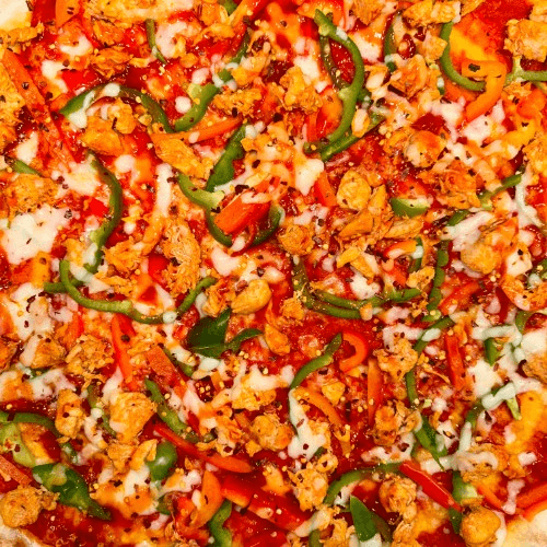 Sweet red and green peppers, spicy chicken and mozzarella cheese.
