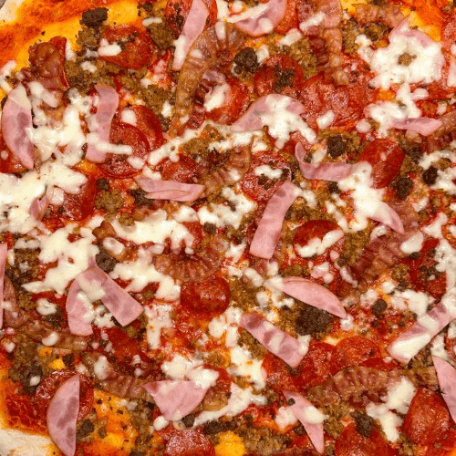 Pepperoni, sweet Italian sausage, Canadian bacon, regular bacon, beef and extra cheese.