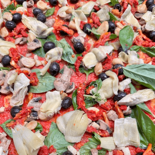 Red sauce. Sun-dried tomatoes, tender artichokes hearts, fresh basil, sautéed mushrooms, black olives and roasted garlic.