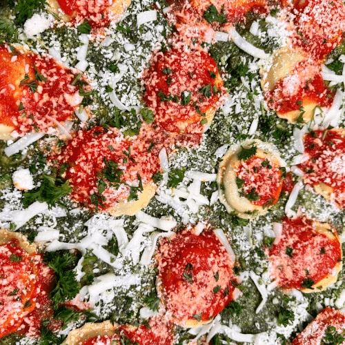 Cheese filled ravioli, pesto sauce and mozzarella cheese
